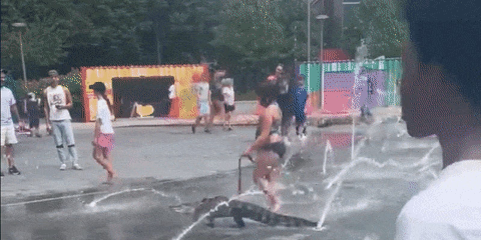PHILADELPHIA -- An unusual sight was caught on video in Philadelphia Friday. Vehicle seen fleeing the area. The gator was seen making friends and enjoying water features at the park according to People.